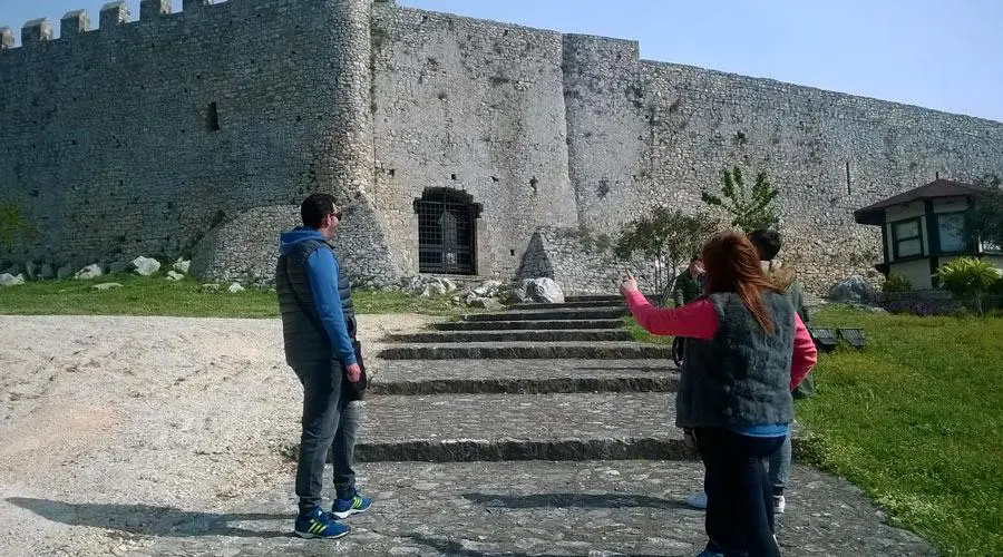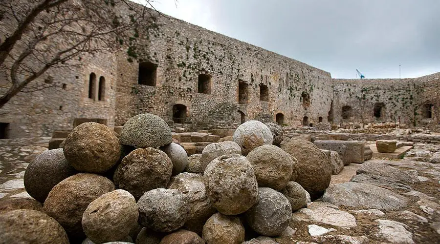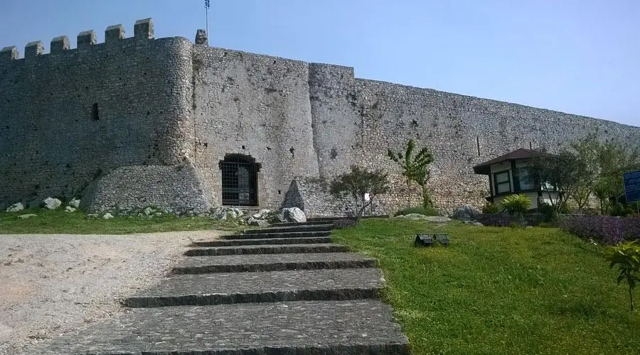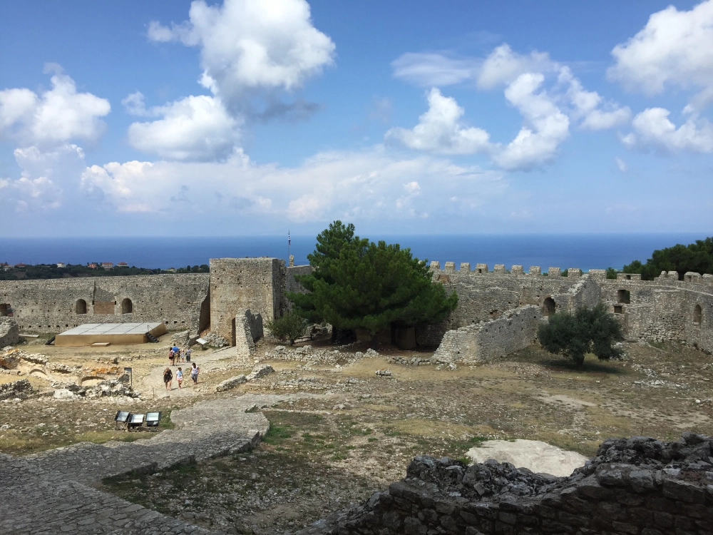 The castle consists of two enclosures . The external enclosure is polygonal and strengthens the fortification on smoother slopes of the hill . To the southeast , on the highest point of the hill , stands the inner precinct , hexagonal , formed by a series of vaulted chambers around a large central avliafli . The walls of the outer enclosure end in transepts and battlements , the current configuration belongs to the Ottoman period, and the three pyrgoisto western part.